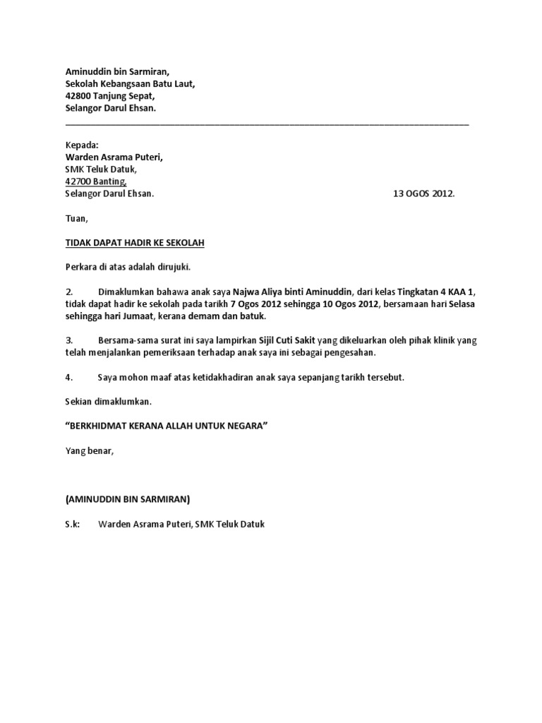 Bagi anda yang memang sedang sakit dan membutuhkan waktu lama untuk pemulihan, maka tidak ada salahnya bagi anda untuk mengajukan cuti kerja kepada atasan. Surat tak hadir ke sekolah via www.slideshare.net. Contoh surat izin sakit tidak masuk sekolah. File yang dibagikan kali ini dalam format microsoft office word, tentu. Masih keliru ini penjelasan cuti sekolah cuti hari raya aidilfitri 2019 astro awani.