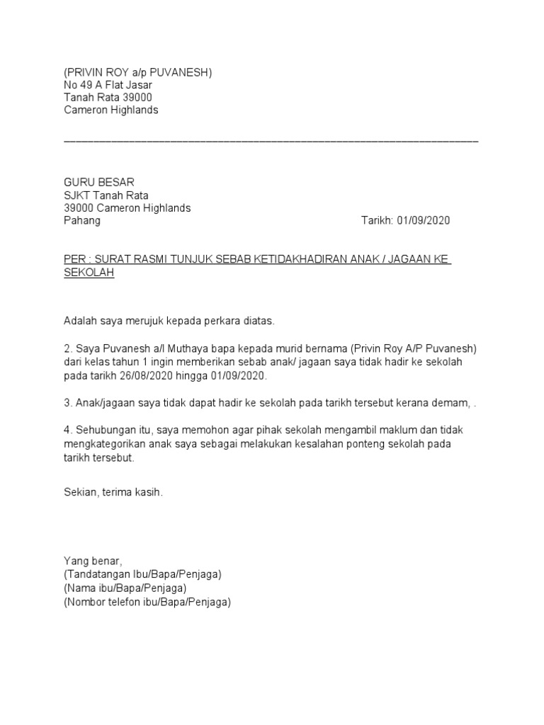 8 people like this.sign up to see what your friends like. Contoh surat rasmi tidak hadir ke sekolah cuti sakit. Baik itu cuti hari raya, cuti panjang ataupun cuti karena sakit parah. Ini adalah contoh surat rasmi memohon cuti daripada pihak sekolah jika pelajar tidak dapat menghadirkan diri ke sekolah tanpa sijil sakit ataupun untuk dikepilkan sekali bersama sijil sakit. Hal ini ditujukan agar tidak dikenakan sanksi di lingkup sekolah maupun di tempat anda bekerja. Contoh surat rasmi tidak hadir ke sekolah (sakit, demam, urusan keluarga dan sebagainya). Contoh surat rasmi tidak hadir ke sekolah cuti sakit urusan keluarga. Contoh surat izin sakit ini bisa kamu gunakan untuk keperluan tidak masuk sekolah, kuliah, atau pun kerja. Contoh surat rasmi tidak hadir sekolah surat sekolah belajar. Nah, glints punya 4 contoh surat cuti kerja untuk beragam alasanmu, yaitu sakit, melahirkan, berkabung, dan cuti tahunan. Contoh surat izin sakit tidak masuk sekolah. Surat cuti tersebut akan dipertimbangkan lagi oleh perusahaan dan atasanmu. Sekiranya bapak kepala sekolah mengizinkan saya akan cuti besok, yakni pada tanggal 2 mei 2010.